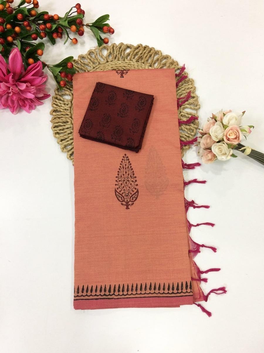 The saree features a soothing peach pink base that transitions gracefully into a rich royal maroon, creating a refined contrast that feels both feminine and classic. Crafted from premium South mix cotton, the fabric is breathable, lightweight, and offers a neat drape—perfect for all-day comfort.
