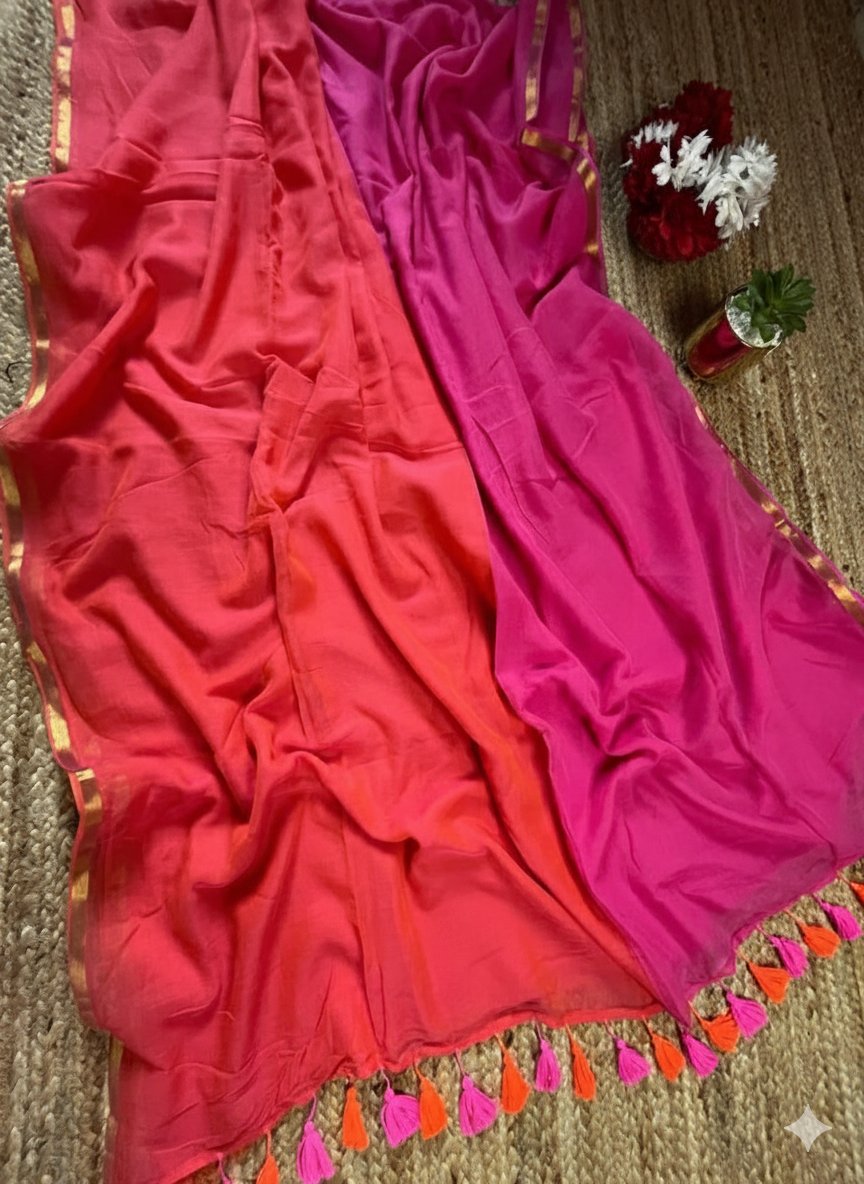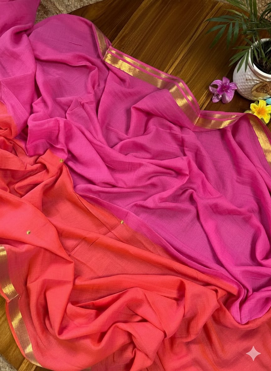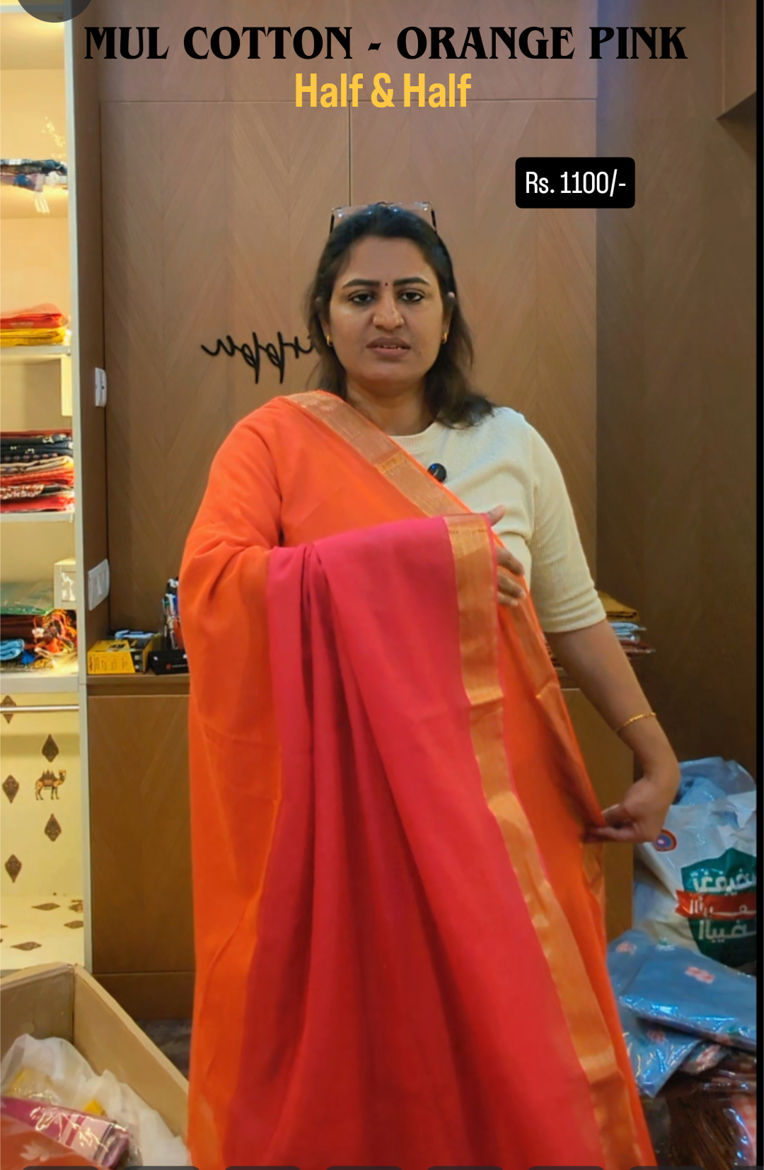 Mul Cotton Saree – Orange & Pink Half-and-Half with Jacquard Border