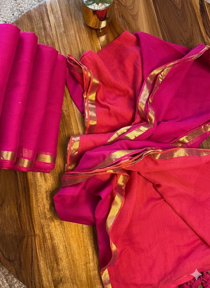 Bright, breathable, and beautifully balanced — this Mul Cotton half-and-half saree in refreshing orange and pink hues is designed for effortless everyday elegance.